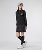 ブラックのモックネックに、黒地に白のチェック柄のプリーツスカートでスポーティな雰囲気の中に上品さもプラスしたコーディネート。グレーのニットキャップでカジュアルさをプラスしています。
