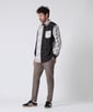 落ち着いたブラウンのパンツに、モノトーンの迷彩柄がパターンデザインされたシャツを黒のスニーカーで全体を引き締めた、スマートなマネしやすいコーディネート。
