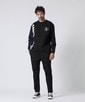 ブラックのPsycho Bunnyロゴ入りスウェットシャツに、同色のシンプルなパンツを合わせ、黒のローカットスニーカーでカジュアルながらも落ち着いた印象のコーディネート。