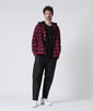 全体的に落ち着いたトーンでまとめつつ、チェックシャツの赤がアクセントとなったカジュアルスタイル。