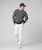 モノトーンゴルフコーデ。総柄のバニーロゴニットも、白と黒でベーシックなカラーリングなので総柄を着ない人でも着やすいデザインニットです。