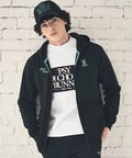 胸の刺しゅうと背面のデザインの配色を統一させた長袖ジップパーカ。