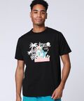 春夏シーズンらしいヤシの木や建物を描いたリゾート感あふれる南国モチーフの背景に、バニーを重ねたキャッチーなアートワークが目を惹きます。鮮やかなカラーリングがコーディネートのアクセントになり、一枚で着てもサマになる主役級のアイテムです。