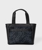 チェーンのように絡み合ったバニーがプリントされた厚のツイル地とレザーライクな合地の組み合わせ。収納に優れた横型ラウンドトートバッグ。ポケットは外側に2、内側に2つと機能性も抜群。
