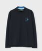 胸に入ったシルエットバニーのロゴ刺繍とバックに入った配色のフォント刺繍、後ろ衿の配色ボーダーがポイント。