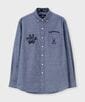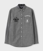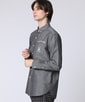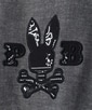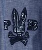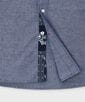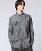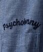 左右で異なるディテールを組み合わせた、インパクトのあるアシンメトリーデザインが魅力。左胸にはオリジナルのバンダナ柄生地を使用したスカルバニーのアップリケを配置し、対となる右胸には大きめのロゴとスクリプトフォントを刺繍で表現しました。さらに、襟裏、カフス裏、下前立てには別布を切り替えて使用。袖をまくった時やボタンを開けた時にちらりと覗くアクセントが、サイコバニーらしい大人の遊び心を演出します。