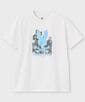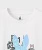 ニューヨークの街並みをサンプリングした、アメリカンムード満点のグラフィックが主役の一枚。摩天楼や道路標識をコラージュしたモノトーンの背景に、ブランドアイコンであるウサギのシルエットを爽やかなブルーで大胆に配置しています。