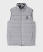 表に無地のストレッチタフタ、裏にオリジナル総柄のストレッチタフタ素材を使用したリバーシブルゴルフベスト。